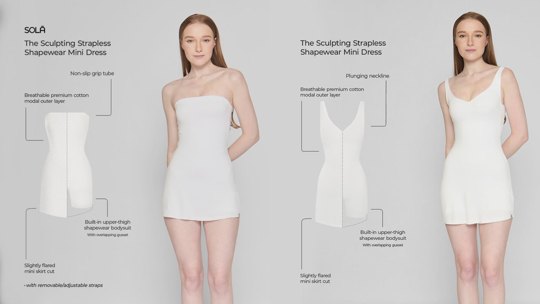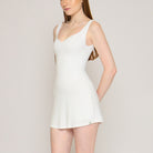A dress and shapewear in one, designed to smooth, sculpt, and support. The Plunging Sculpting Mini Dress features a built-in upper-thigh shapewear bodysuit that enhances the bust, cinches the waist, lifts the butt, and sculpts the thighs for a flawless silhouette. It has a plunging neckline that highlights the décolletage, scoop back, and a slightly flared mini skirt cut.