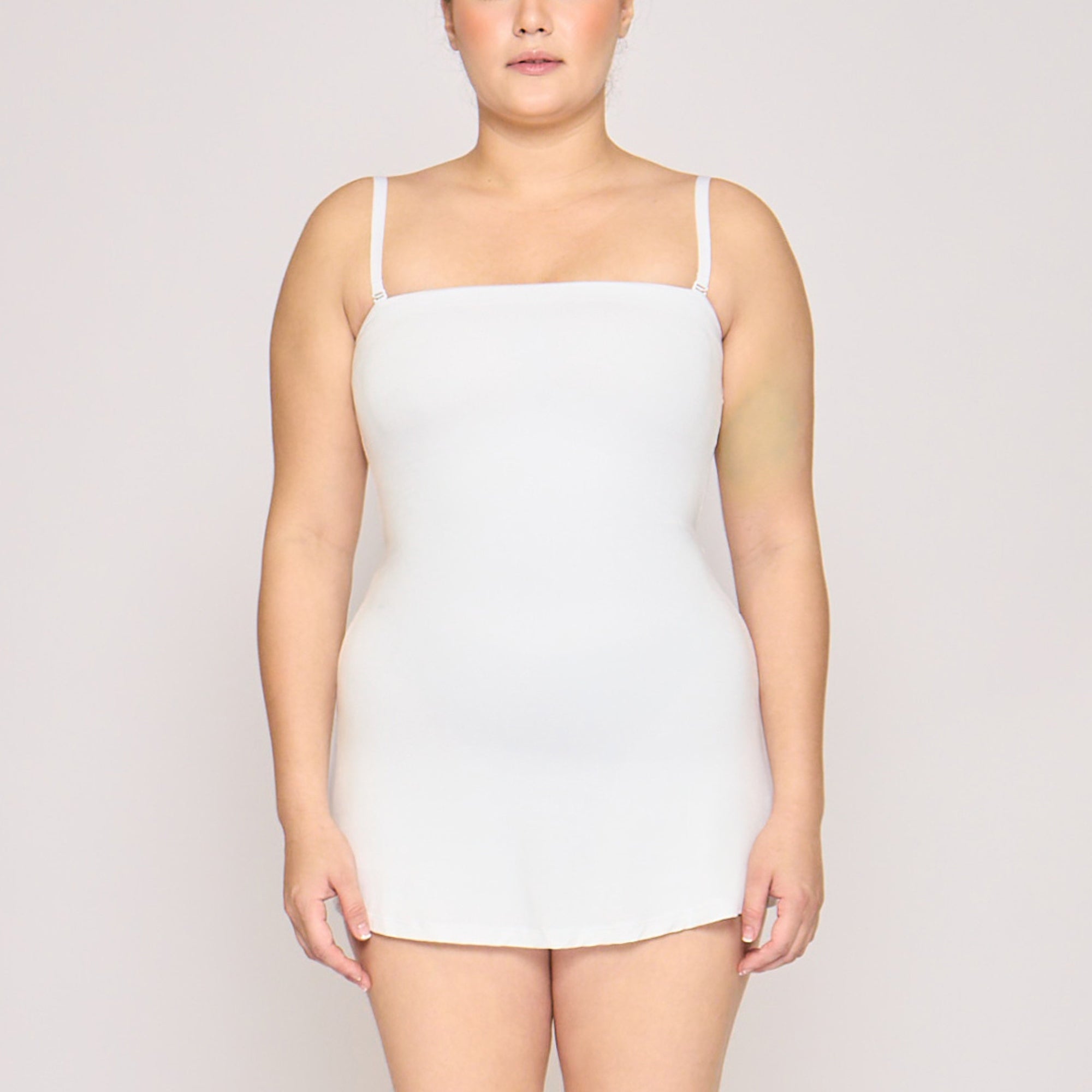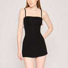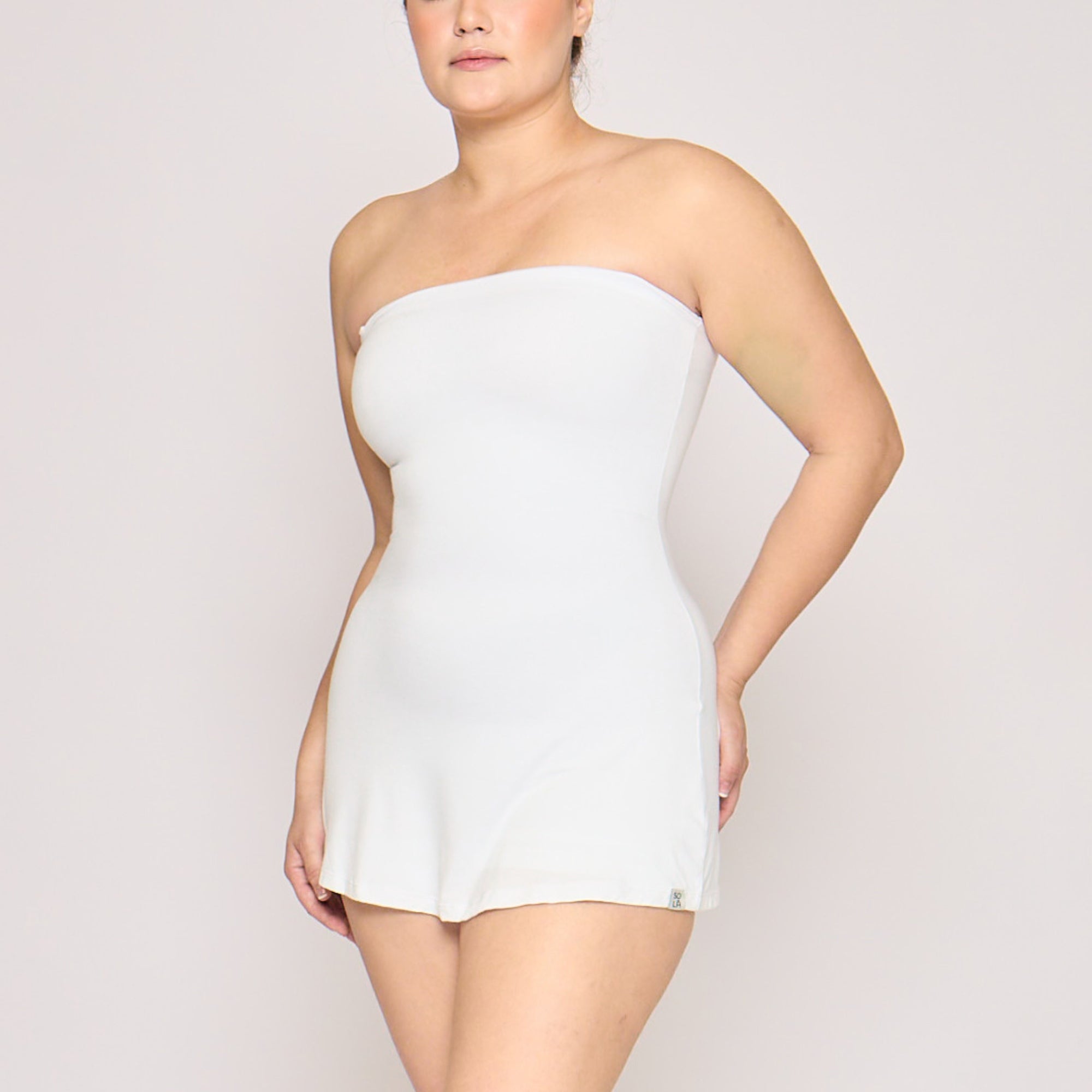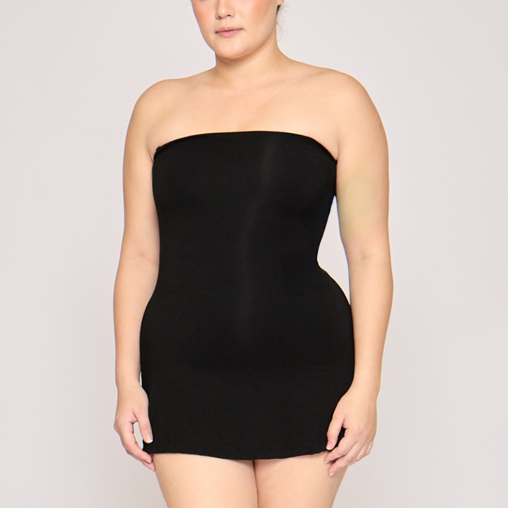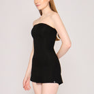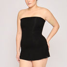 A dress and shapewear in one, designed to smooth, sculpt, and support. The Strapless Sculpting Mini Dress features a built-in upper-thigh shapewear bodysuit that enhances the bust, cinches the waist, lifts the butt, and sculpts the thighs for a flawless silhouette. It has a straight neckline that highlights the shoulders, and a slightly flared mini skirt cut. It comes with adjustable & removable straps for versatile styling.
